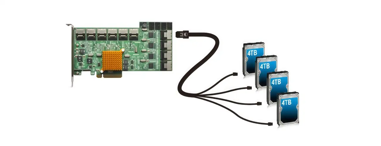- JBOD- и EBOD-полки — подключаются через внешние SAS-порты (SFF-8644). Одним HBA можно каскадировать до 1024 устройств (зависит от экспандера).