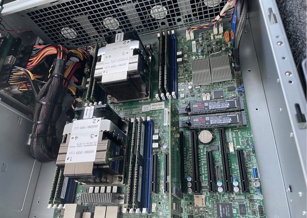 Материнская плата - Supermicro X11DPH-i. Два сокета LGA 3647, несколько PCIe x16, два M.2, IPMI для удалённого управления. Мы уже собирали на ней GPU-сервер с двумя RTX 3090 - платформа знакомая, о той сборке есть отдельная статья.
