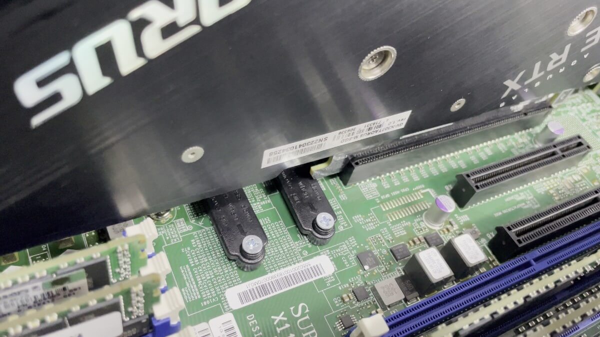 На Supermicro X11DPH-i два штатных M.2-слота. Мы уже сталкивались с этим при сборке GPU-сервера на двух RTX 3090: ответная часть фиксатора GPU ложится прямо на второй слот M.2. Физически перекрывает и диск туда не вставить. Подробный разбор и решение - в нашей статье про ту сборку.