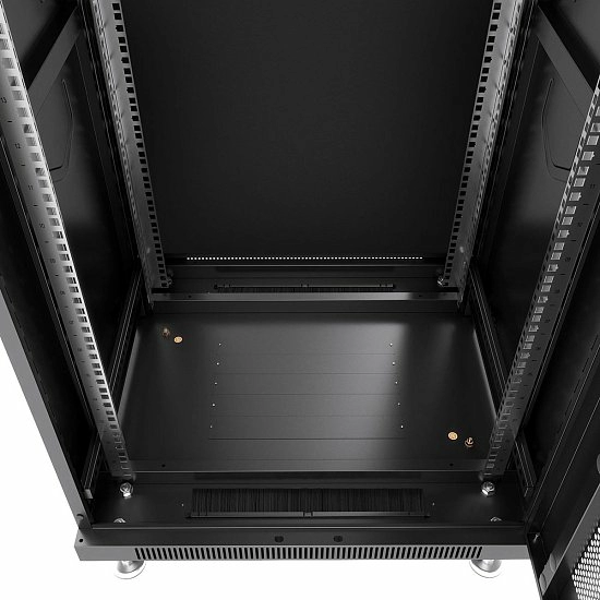 Комплектация Передняя дверь с замками; задняя дверь с замками; 2 боковые съемные панели; 2 пары 19" монтажных профилей имеют Юнитовую (U) разметку; регулируемые и роликовые опоры; крепежный комплект 30шт. (винт+квадратная гайка), дно с люками для ввода кабеля