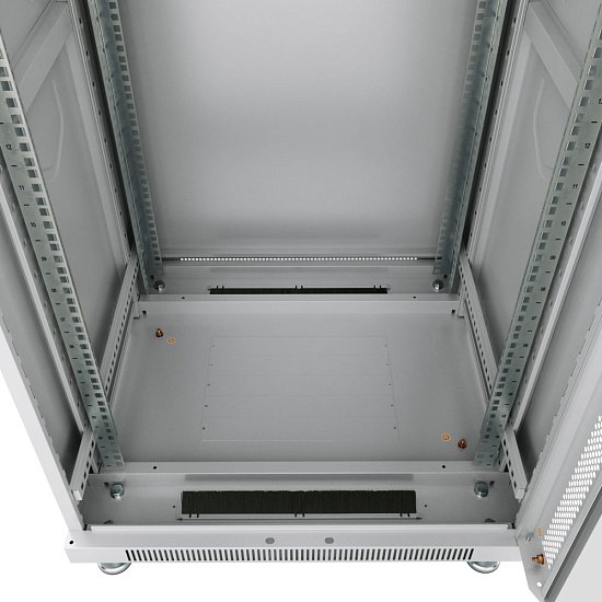 Комплектация Передняя дверь с замками; задняя дверь с замками; 2 боковые съемные панели; 2 пары 19" монтажных профилей имеют Юнитовую (U) разметку; регулируемые и роликовые опоры; крепежный комплект 30шт. (винт+квадратная гайка), дно с люками для ввода кабеля