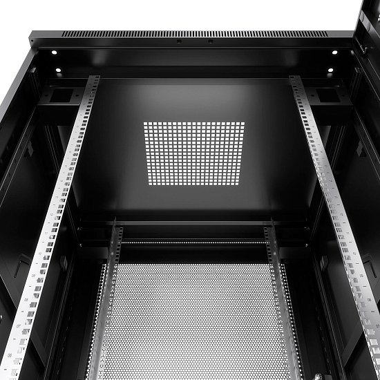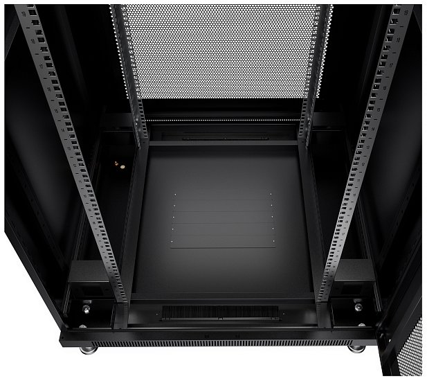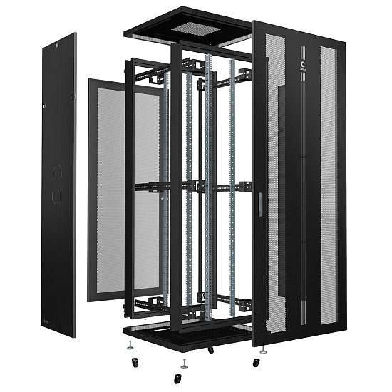 Комплектация Передняя дверь с замками; задняя дверь с замками; 2 боковые съемные панели; 2 пары 19" монтажных профилей имеют Юнитовую (U) разметку; регулируемые и роликовые опоры; крепежный комплект 30шт. (винт+квадратная гайка), дно с люками для ввода кабеля